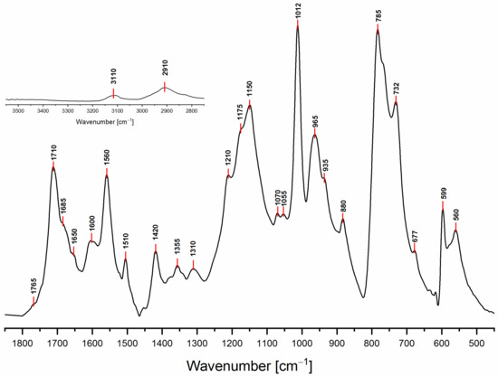 As a preliminary observation from the analysis of Figure 3, it is evident that the broad band that characterizes the FA in the 3600–3000 cm−1 spectral region (see Supplementary data for FA spectrum), associated with hydroxyl group stretching, is not present in the hardened PFA spectrum, confirming that the percentage of unreacted FA is below the detection limit of the technique. At the same time, for the same reason, it is possible to exclude the presence of levulinic acid.
