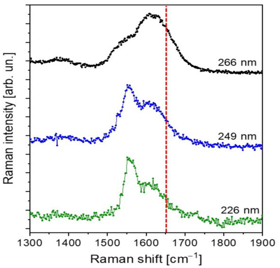 UV-Raman spectra of hardened PFA collected with UV laser excitation at 266 nm (black curve), and with synchrotron radiation excitation at 249 nm and 226 nm (blue and green curves respectively). Red dotted line pinpoints the 1650 cm−1 wavenumber.