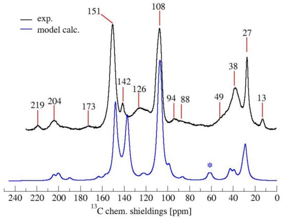It can be appreciated that the simulated 13C-NMR spectrum of the model PFA structure is in good agreement with the experimental one. In particular, the prominent furan-carbon signals at 108 and 151 ppm, as well as the methylene carbon signal at 27 ppm and the carbonyl carbon signals at 204 and 219 ppm, find their close counterparts in the simulated spectra. The greatest gap between the calculated and experimental 13C-NMR is due to the signal at 60 ppm (marked by an asterisk) in the simulated spectrum, which has no counterpart in the experimental spectrum. This signal most likely originates from the two terminal furan-units of structure (7), the contribution of which is an artifact of modeling the polymer by considering only a short moiety.