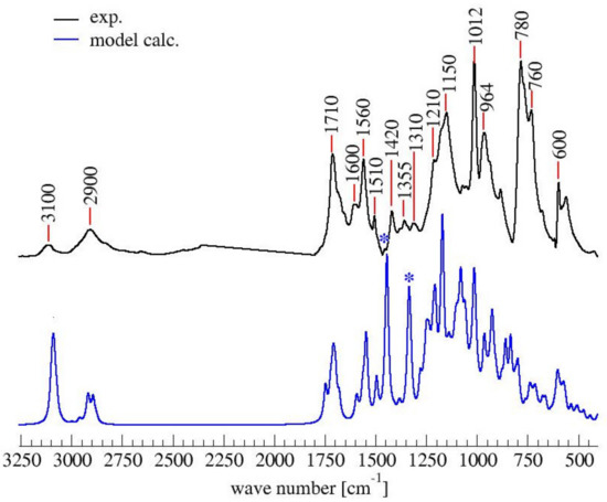 Comparison of experimental and calculated FTIR spectrum of PFA. With * the bands due to the artifact of the model.