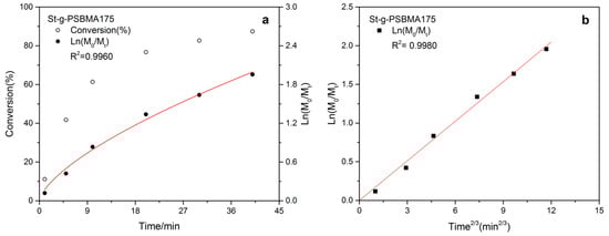 As shown in Table 2, copolymers of PSBMA with starch (St-g-PSBMA) were also synthesized with Cu0-mediated LRP. The FT-IR and 1H-NMR spectra of the copolymer could be seen in Figures S9 and S10, respectively. It was noticed that the initial monomer concentration of 0.67 M was too low for the successful synthesis of copolymer when the ratio of CuBr to Me6TREN was set to 1.2:0.6 (entry 1, Table 2). Interestingly, when the monomer concentration was increased to 0.75 M (entry 2, Table 2), a power-law dependence plot of the conversion index (ln[M0/Mt]) on time was obtained (Figure 4a). The kinetics of living radical polymerization, according to earlier publications [32,33], can be divided into stationary-state and power-law kinetics. Equation (1) represents the stationary-state kinetic which is applicable to systems with a relatively large initiation rate, while the power-law kinetic normally could be observed in systems with zero or a very low initiation rate [32]. In the present research, the low initiation rate may be attributed to the high initial deactivator concentration due to the disproportionation of CuBr (see Experiment part Section 2.4 and the initiator-to-CuBr ratio in Table 2). The power-law kinetic could be represented by Equation (2) [32].