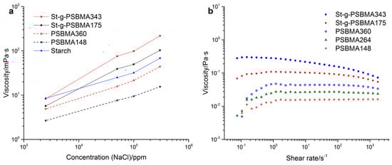 A preliminary study on the rheological properties of PSBMA and St-g-PSBMA was carried out at the same polymer concentration (5.0 wt %). The anti-polyelectrolyte property of synthesized polymers was studied in sodium chloride solution the concentration of which ranges from 2500 to 300,000 ppm. As shown in Figure 5a, the viscosity of all the samples increased with increasing salt concentration. The increase in the viscosity of starch solution was attributed to the “structure” change of water due to the addition of NaCl (e.g., the reducing of free water) [34,35]. For polyzwitterionic polymers, the addition of NaCl breaks the intramolecular electrostatic interaction, and thus a more extended polymer chain (larger hydrodynamic volume) results in the increase of solution viscosity [1,2]. Compared with PSBMA homopolymer, higher viscosity was observed on St-g-PSBMA copolymer with similar PSBMA chain length, especially at higher salt concentration. Moreover, higher increment ratio in the viscosity of St-g-PSBMA compared with corresponding homopolymer and starch indicated a faster increase in the hydrodynamic volume of copolymer with changing salinity, especially in the lower salinity range. These indicated a successful grafting of PSBMA on starch.