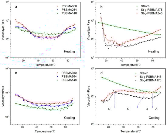 Solution viscosity vs. temperature of (a) PSBMA homopolymer (Heating), (b) St-g-PSBMA (Heating), (c) PSBMA homopolymer (Cooling), and (d) St-g-PSBMA (Cooling) (the solid line is to guide the eye).