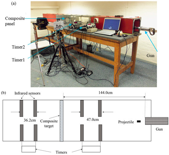 Setup of the ballistic impact: (a) Ballistic range; and (b) Schematic of the ballistic range for composite ballistic performance evaluation.