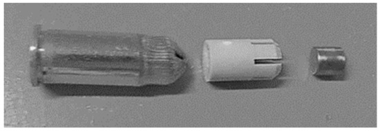The ballistic performance of the composite panels was examined on a ballistic range, as illustrated in Figure 3. The amount of time it took for the projectile to travel through the two slots located before and after the target could be recorded by two timers each. The impact and residual velocities are calculated, given the distance travelled. For the non-perforated tests, only the impact velocities could be tracked and the residual velocities are zero because the projectile was stopped by the composite targets. The impact projectile is a steel cylinder of 1.06 g with a diameter and height of 5.5 mm. Propelled by a blank cartridge, the projectile impacts the targets at a velocity of 450–500 m/s. Details of the projectile assembly used for the ballistic impacts are provided in Figure 4.