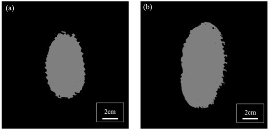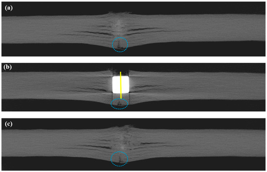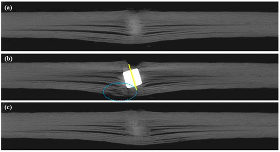 Although it is technically difficult to catch the movement of the projectile as it proceeds inside the composite panel, the 2D cross-sectional images obtained from X-ray CT provides an insight into the damages caused by the impact, which can be obtained in a non-destructive manner. Slice (b) presents the slice image through the centre of the projectile while slices (a) and (c) present the first and last slices without the projectile around the impact location. These slice images of composite plates P10B and P17C are illustrated in Figure 5 and Figure 6, respectively. Detailed post-mortem analyses were conducted on the projection images and the results are summarised in Table 6.
