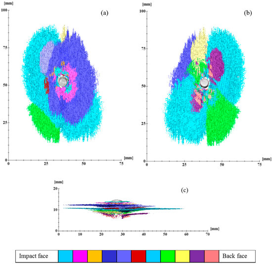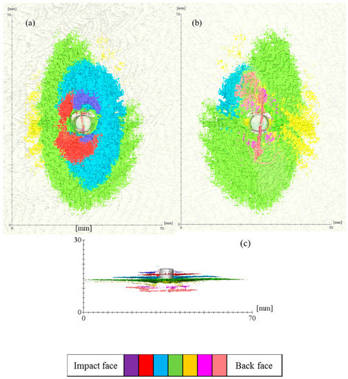Delamination volume of P10B at different positions: (a) View from impact face; (b) View from back face; and (c) Cross-sectional view.