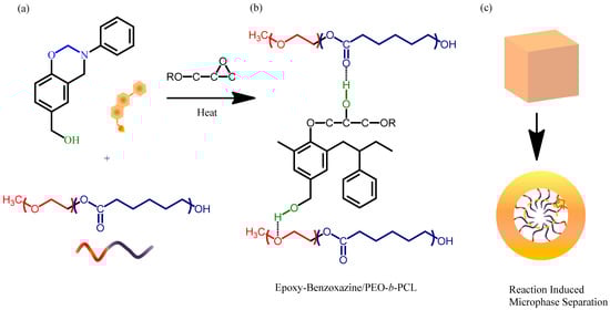 Because epoxy resins possess excellent thermal and mechanical properties, good chemical resistance, ready processability, and excellent adhesion to many substrates, they have many applications in composites—for example, as encapsulates for semiconductor materials, surface coatings, adhesives, and painting materials [,,]. Nevertheless, common epoxy resins are often brittle; therefore, much effort has been exerted to improve the flexibility of epoxy resins and to understand their structure–property relationships [,]. Two main factors that affect the flexibility of modified epoxy resins are the size distribution and concentration of the additive components. As a result, two major approaches have been developed to enhance the flexibility of epoxy resins: (i) adding a soft segment (e.g., siloxane unit) into the main structure of the epoxy resin [,], and (ii) blending with a polymer or nanofiller (e.g., clay [,], polyhedral oligomer silsesquioxane [,,], carbon nanotubes [,], liquid rubber [], poly(ethylene oxide) (PEO) [], poly(ε-caprolactone) (PCL) []) as a toughness agent. Blending an epoxy resin with a homopolymer or nanofiller in the absence of specific interactions will, however, usually result in macrophase separation through reaction-induced phase separation [].