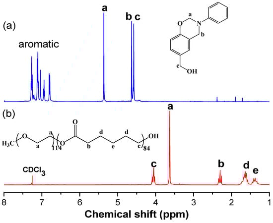Figure 3 displays 1H NMR spectra of the benzoxazine monomer PA-OH and the diblock copolymer PEO-b-PCL used in this study. The 1H NMR spectrum of PA-OH (Figure 3a) features signals at 5.36 and 4.63 ppm, representing the CH2 protons of the oxazine ring; another at 4.55 ppm representing the CH2OH protons; and multiplets at 6.8–7.4 ppm, representing the aromatic protons. The molecular weight of PEO-b-PCL was measured based on its 1H NMR spectrum, considering the signals for the ether units of MPEG-5K at 3.65 ppm (–CH2CH2O–), and for the OCH2 units of the PCL segment at 4.10 ppm (Mn = 15,000; PDI = 1.15, based on GPC analysis).