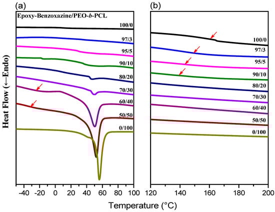 Differential scanning calorimetry (DSC) thermal analyses of epoxy–benzoxazine/PEO-b-PCL blends of various compositions (second heating scans), expanded from (a) −40 to +100 °C and (b) 120 to 200 °C.