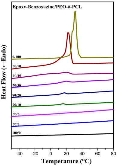 DSC cooling scans of epoxy-benzoxazine/PEO-b-PCL blends (cooling rate: 5 °C min−1).