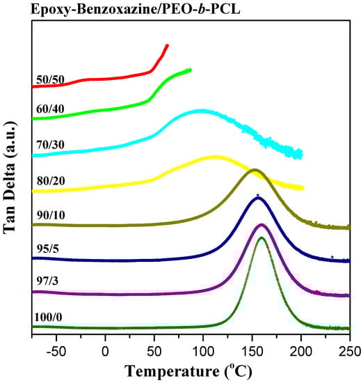 DMA tan δ–temperature curve of epoxy–benzoxazine/PEO-b-PCL blends (heating rate: 2 °C·min−1).