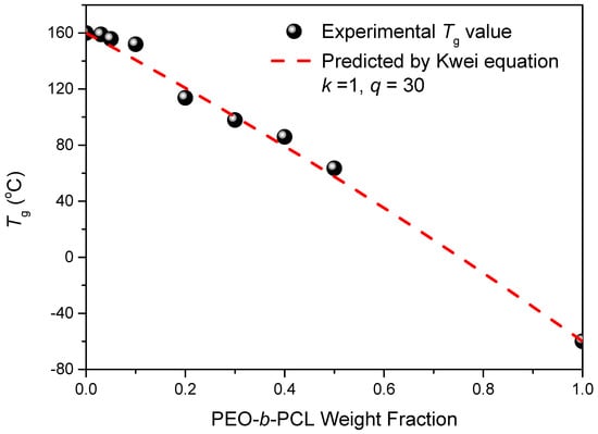 Glass transition temperature composition curve of epoxy–benzoxazine/PEO-b-PCL blends, based on the Kwei equation.