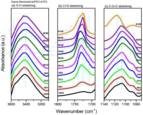 Fourier transform infrared (FTIR) spectra (recorded at room temperature) of epoxy–benzoxazine/PEO-b-PCL blends, displaying the (a) OH, (b) C=O, and (c) C–O–C stretching regions.
