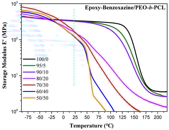 DMA storage modulus curve of epoxy–benzoxazine/PEO-b-PCL blends (heating rate: 2 °C·min−1).