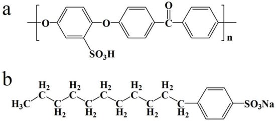 Structural formulae of (a) sulfonated poly(ether ether ketone) (SPEEK) and (b) sodium dodecyl benzene sulfonate (SDBS).