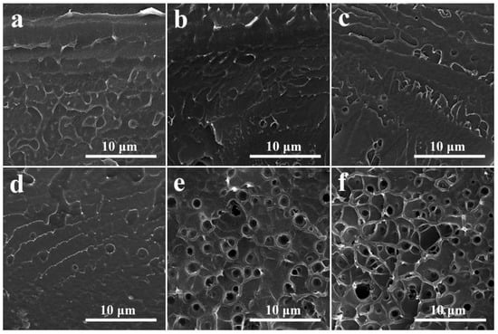 SEM images of (a) a SPEEK membrane and SPEEK/SDBS membranes with SDBS contents of (b) 2 wt %, (c) 4 wt %, (d) 10 wt %, (e) 15 wt %, and (f) 20 wt %.
