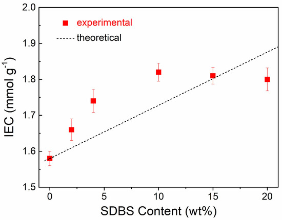 The IECs of the SPEEK/SDBS membranes with various SDBS contents are exhibited in Figure 3. The IECs of the SPEEK membrane and SDBS were determined to be 1.58 mmol g−1 and 3.06 mmol g−1, respectively. With increasing SDBS content, the IEC of the SPEEK/SDBS membranes first increases until it reaches a maximum of 1.82 mmol g−1 at 10 wt % SDBS content and then remains almost unchanged. Compared with SPEEK, SDBS exhibits a higher IEC, so the incorporation of SDBS into the SPEEK matrix could increase the IEC of the SPEEK/SDBS membranes. Additionally, we assume that the IECs of SPEEK/SDBS membranes linearly increase with increasing SDBS content; thus, the theoretical IECs of SPEEK/SDBS membranes should follow the dashed line shown in Figure 3, which is the connection between the IECs of SPEEK (SDBS content of 0 wt %) and SDBS (SDBS content of 100 wt %). However, it is found that the experimental IECs of SPEEK/SDBS membranes with no more than 10 wt % SDBS are much higher than the theoretical value, indicating that the protons for titrating are more dissociated than expected. Such a phenomenon should be attributed to the good dispersion of SDBS in the SPEEK matrix and the promotion of proton dissociation through ion clusters between SPEEK and SDBS when no more than 10 wt % SDBS is added. In comparison, when the SDBS content is higher than 10 wt % in the membranes, the leakage of undissolved SDBS occurs, as illustrated in the SEM observation mentioned above, which should not lead to an increase in the actual SDBS content in the membrane with further SDBS addition. As a result, the SPEEK/SDBS membranes with SDBS contents of 15 wt % and 20 wt % show almost the same IEC as the membrane with 10 wt % SDBS.
