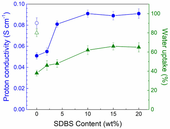The proton conductivity and water uptake of the SPEEK/SDBS membranes with various SDBS contents are exhibited in Figure 4. For the membrane water uptake, a gradual increase with SDBS is expected because the hygroscopic SDBS tends to absorb more water than does SPEEK, and the voids created by the leakage of SDBS are responsible for the slightly increased water uptake at high SDBS content. Moreover, with increasing SDBS content, the proton conductivity of the SPEEK/SDBS membranes greatly increases at first and then levels off, which is consistent with the change in the membrane IEC. Such an enhancement in the membrane proton conductivity with low SDBS addition should be due to two main factors. Firstly, SDBS has a higher IEC and thus can dissociate more protons than SPEEK, so the introduction of SDBS can create more continuous proton transfer channels in the membrane. Secondly, the formation of ion clusters between the sulfonic acid groups of SPEEK and SDBS could result in stronger dissociation of protons, further facilitating the hopping of protons. However, the actual SDBS content in the membrane does not increase with further increasing SDBS content above 10 wt %, thus leading to unchanged proton conductivity. It should be noted that the formation of ion clusters between the sulfonic acid groups of SPEEK and SDBS would not lead to an additional increase in water uptake. As a result, the SPEEK/SDBS membrane with 10 wt % SDBS exhibits much higher proton conductivity than the SPEEK membrane, with the proton conductivity rising from 0.051 S cm−1 to 0.091 S cm−1, while the water uptake increases from 38% to 62%. For comparison, the SPEEK membrane with a DS of 73% only achieves the proton conductivity of 0.082 S cm−1 with relatively high water uptake (80%). Although the enhancement in proton conductivity in our work was not as high as that of the previous reported SPEEK membrane using SDBS-adsorbed graphene oxide (GO) as a filler (the proton conductivity rising from 39.5 mS cm−1 to 93.8 mS cm−1 by using 8 wt % filler) [13], to improve the proton conductivity by directly incorporating SDBS into SPEEK is a more cost-efficient approach and is easier to handle.