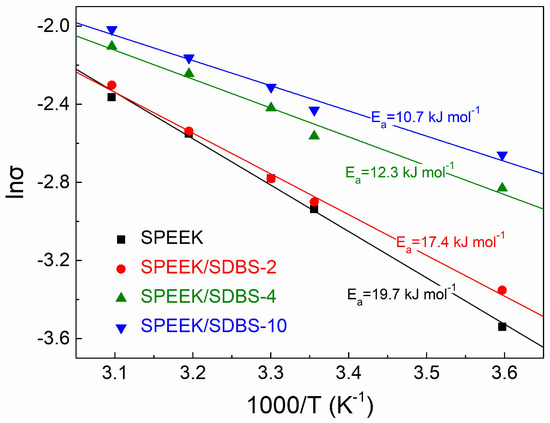 The activation energy for proton conduction (Ea) reveals the minimum energy required for proton transport from one free site to another, and a low Ea indicates lower energy loss caused by ionic resistance of the membrane, which is beneficial for the energy utilization of PEMFCs [13]. Figure 5 shows the Arrhenius plots of proton conductivity (σ) for SPEEK and SPEEK/SDBS membranes with SDBS contents of 2 wt %, 4 wt %, and 10 wt %, and Ea (kJ mol−1) can be derived from the linear fitting of the plots using the following equation [26]: