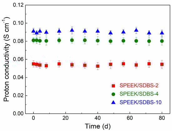 Generally, the leakage of water-soluble low-molecular-weight compounds in PEMs is extremely serious, so it is quite necessary to evaluate the stability of SDBS in the SPEEK membrane. The SPEEK/SDBS-2, SPEEK/SDBS-4, and SPEEK/SDBS-10 membranes were immersed in water that flowed continuously, and proton conductivities were tested at various times to check the stability of the membranes. As shown in Figure 7, the proton conductivities of the three SPEEK/SDBS membranes remained almost constant after 80 days, indicating that SDBS is quite stable in the membranes without leaking. Additionally, the weight of the membranes remains constant during the test, also illustrating that the SDBS could not have leaked out. These results can be explained as follows: SDBS is an amphiphilic molecule with one end being hydrophilic and the other end being lyophilic. The relatively long alkyl chain of SDBS can be entangled with hydrophobic-phase macromolecules in SPEEK, while the sulfonic acid groups of SDBS can form ionic clusters with the sulfonic acid groups in SPEEK. Therefore, the migration of SDBS would encounter large resistance in either the hydrophilic or the hydrophobic phase. The SEM images also confirm that SDBS is well embedded in SPEEK when the loading of SDBS does not exceed 10 wt %.