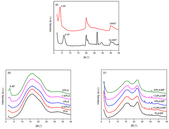 The XRD patterns of Na-MMT and OMMT powders, virgin and OMMT-modified PLA, and the WF composites are shown in Figure 1. The crystal (001) plane diffraction peak of Na-MMT was located at 2θ = 6.05°, corresponding to the d001 value of 1.46 nm. After modifying with DDAC, the peak shifted to a lower location at 2θ = 3.98°, indicating the enlarged interlayer distance of MMT of 2.22 nm, see Figure 1a. This was because the long organic chain ion of DDAC was entered into the galleries through a cation exchange reaction. This characteristic peak can be also observed in OMMT-modified PLA samples, see Figure 1b, irrespective of OMMT contents. In addition, the interlayer distances were further enlarged to 3.68 nm (2θ = 2.40°) due to the infiltration of PLA chains into the silicate layers [28]. It should be noted that both the virgin and OMMT-modified PLA were almost amorphous because of the quick cooling [32]. The results could also be proved by the relatively low crystallinity of PLA, which was calculated using the XRD, see Table 1. However, the incorporation of OMMT could slightly improve the crystallinity of PLA due to the nucleating effect [25]. After the introduction of WF, the characteristic peak of WF at 2θ = 17° and 22.5° existed, while that of OMMT at 2θ = 2.40° in OMMT-modified PLA samples completely disappeared, see Figure 1c. Liao and Wu [33] added 7 wt % of clay into poly(ethylene-octene)/WF elastomer and also found no apparent peaks. They suggested that the clay had been fully exfoliated into individual and collapsed silicate layers, thus no regular crystalline structure could be obtained from the XRD patterns. As mentioned above, the WPC was prepared by first compounding OMMT with virgin PLA. Therefore, redistribution of OMMT may occur during the second extrusion process, forming a more uniform dispersion of the OMMT with exfoliated structures in the PLA matrix. However, the crystallinity was less affected by OMMT in the PLA/WF composites. More details could be provided by TEM images.