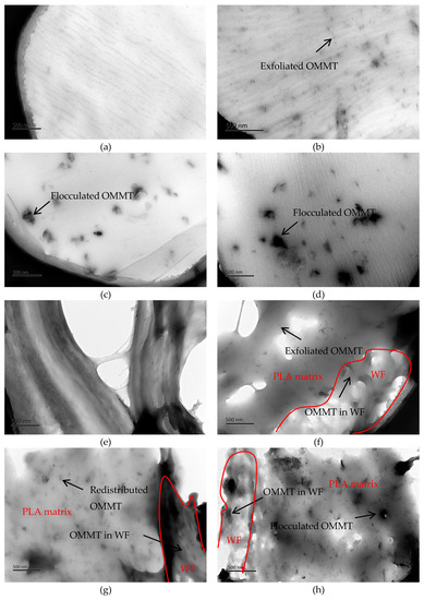 TEM images of virgin and OMMT-modified PLA and the composites. (a) PLA; (b) 0.5/PLA; (c) 1.5/PLA; (d) 2/PLA; (e) PLA/WF; (f) 0.5/PLA/WF; (g) 1.5/PLA/WF; (h) 2/PLA/WF.