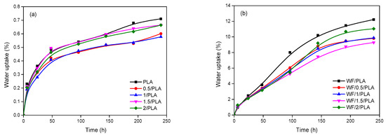 The water uptake (WU) and thickness swelling (TS) tests were carried out according to the Chinese standard GB/T 17657-2013 on the samples with a size of 50 × 50 × 3 mm3 with complete immersion in water at 20 ± 2 °C. The WU was calculated based on the weight percent gains at intervals of 6, 24, 48, 96, 144, 192, and 240 h. The weights were taken after the removal of excessive water on the sample surface. The TS was determined based on the mid-span thickness changes till the end of the test. The average WU, TS, and standard deviations were based on the values of six replicates. To further understand the water absorption process, the Fick’s diffusion coefficients of PLA and PLA composites were calculated according to Equation (2) [31].