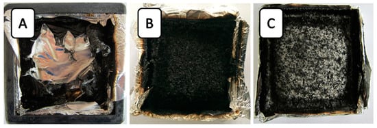 Digital photos of residues from the cone calorimeter test. (A) Neat RPUF; (B) 14AO/14B/6E/PU; (C) 14ATH/14B/6E/PU.