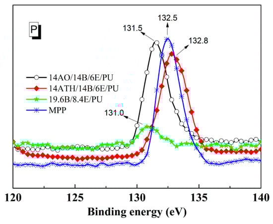 The different phosphorus binding energies from XPS in Figure 5 support the previous deduction. The binding energy values 131.5 and 131.0 eV of phosphorus in 14AO/14B/6E/PU and 19.6B/8.4E/PU residues were close to each other, implying that the phosphorus elements stayed in similar chemical structure, and AO just slightly interacted with phosphorus-containing components from BH. However, the phosphorus in the residue of 14ATH/14B/6E/PU showed a different binding energy result. The binding energy value of the phosphorus raised to 132.5 eV, which is closer to the 132.8 eV of phosphorus in melamine polyphosphate (MPP). This result reveals that the phosphorus content from BH in 14ATH/14B/6E/PU was converted to a polyphosphate structure, as is the phosphorus style in MPP. Since the phosphorus components in 14AO/14B/6E/PU and 19.6B/8.4E/PU all did not generate similar binding energy values, it can be determined that the existence of ATH helped the phosphorous components to form a polyphosphate structure. Further, the one difference between ATH and AO in decomposition products is that ATH can release water during decomposition. Water from ATH should be the crucial medium to help phosphorus in BH to transform to a polyphosphate structure.