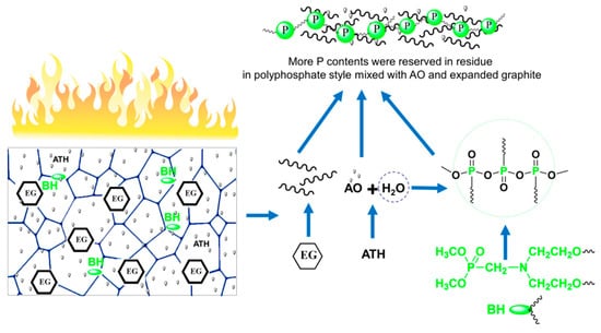 In ATH/BH/EG ternary flame retardant systems, the condensed-phase synergistic flame retardant mechanism of ATH with BH/EG was systematically investigated. The ATH/BH/EG ternary synergistic flame retardant mechanism is illustrated in Figure 6. When the RPUFs containing ATH/BH/EG were ignited, EG expanded rapidly and formed a worm-like thermal-insulating layer. At the same time, water molecules were produced from decomposed ATH. Then, the water directly combined or captured phosphate-containing components or their derivatives to generate polyphosphate. The worm-like expanded graphite, AO, and polyphosphate combined with each other to form a phosphorus-rich compact char layer. The char layer not only prevented the release of combustible gas, but also inhibited the thermal feedback to the RPUF matrix and further effectively decreased the decomposition velocity of the matrix. The formation of polyphosphate also locked more phosphorus and carbonaceous components in the residue, which reduced the “fuel” and smoke density. ATH/BH/EG generated a well-working condensed-phase ternary synergistic effect, which can endow RPUFs with better flame retardant performance.