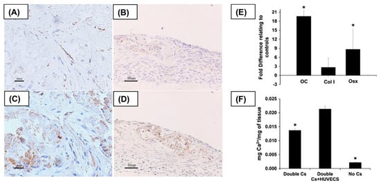 Enhancement of bone-forming ability by co-cultured rat bone marrow stromal cells (rBMSCs) and human umbilical vein endothelial cell (HUVEC)-derived cell sheets (CSs) generated by PNIPAAm-grafted TCPS. Deposition of bone minerals within host tissues after the co-cultured CS implantation. (A,C): Co-cultured CS. (B,D): Monoculture of rBMSC CSs. Immunostaining of SRY (A,B) and osterix (C,D). The increase in osteogenic matrix in the dorsal flap in mice after implantation of co-cultured CS. (E,F) Reproduced with permission from [64].