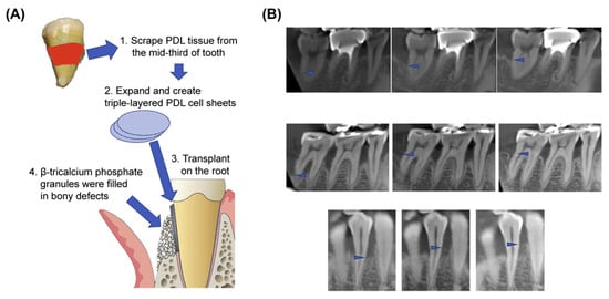 Periodontal tissue engineering with autologous periodontal ligament (PDL)-derived cell sheets. (A) Schematic diagram of the implantation of multi-layered patient-derived PDL cell sheets induced by PNIPAAm-immobilized TCPS. (B) Regeneration of periodontal tissues with increased bone height in representative cases. Arrowheads: the most apical part of bone defects. Reproduced with permission from [82].