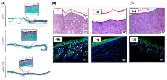 Epidermis regeneration by human adipose-derived MSCs-CS engineering in full-thickness wound skin mice. (A) Formation of Rete Ridges-like epidermis in hMASC-CS group (Masson’s trichrome staining). (Bi,iii) Hair-follicle (white arrows) formation in neo-epidermis at the hAMSC-CS transplanted defect sites, and (Bii,iv) hAMSC-TCP transplanted groups. (Cv,vi) Epidermis morphogenesis driven by hAMSCs-CS transplantation after 21 days. Keratin 14 (green), and DAPI (blue); scale bar = 50 μm. Reproduced with permission from [94].