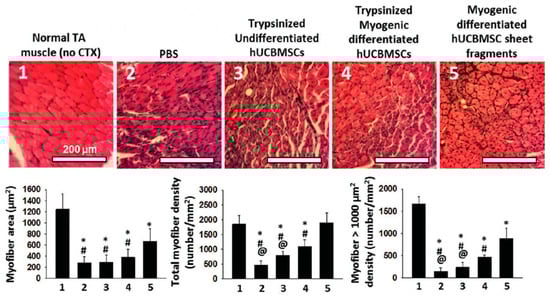 Skeletal muscle regeneration after transplantation of myogenically differentiated human umbilical cord blood mesenchymal stem cell (hUCBMSC) sheet fragments in cardiotoxin (CTX)-induced mice models. hUCBMSC derived myogenic differentiated cell sheets improved tibialis anterior (TA) muscle regeneration estimated by hematoxylin and eosin staining. Restoration of TA muscle specific extracellular matrix (ECM) (laminin) Scale bar = 100 μm. Reproduced with permission from [110].