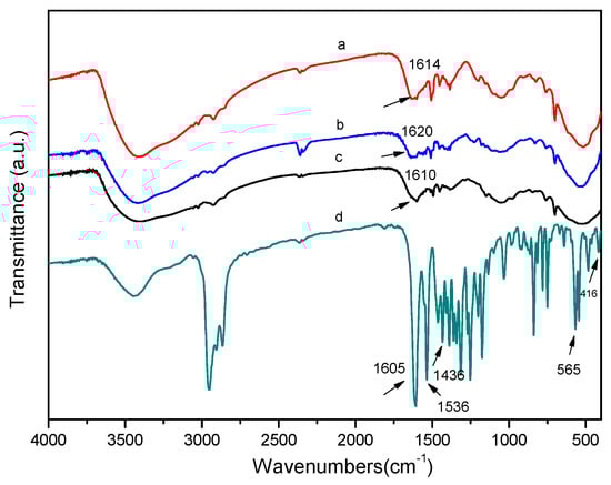 The FT-IR spectra of the immobilized MnIII (salen) catalysts and the corresponding homogeneous MnIII (salen) catalyst can be seen in Figure 1. In Figure 1a–c, the spectrum shows intense and large bands in the region of 3200–3600 cm−1. These bands are attributed to the surface residue –OH from SiOH and the H2O. The bands at near 1026 cm−1 mainly belong to Ph–O–C stretching vibrations, which appeared in the supports of ZSPP, ZPS-IPPA, or ZPS-PVPA. In Figure 1d, bands at 1605, 1536, 1436, 565, and 416 cm−1 can be identified, which relate to the homogeneous MnIII (salen) catalyst. After grafting the MnIII (salen) onto the 3-aminopropyltrimethoxysilane-functionalized ZSPP, ZPS-IPPA, or ZPS-PVPA, a new characteristic band appeared at around 1615 cm−1, which is assigned to the C=N stretching vibration in the MnIII (salen) framework. Obviously, the structure of the MnIII (salen) complex is maintained in the immobilized state []. Notably, the characteristic vibrations of C=N slightly shifted from 1605 to 1610–1620 cm−1 after grafting, compared with those of the neat complex (Figure 1a–c vs. Figure 1d). The results showed that the chiral MnIII (salen) complex was axially immobilized on the organic polymer–inorganic zirconium hydrogen phosphate through the 3-aminopropyltrimethoxysilane linker.