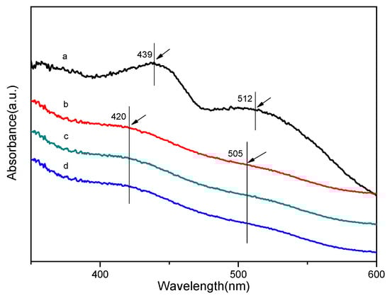 Figure 2 shows the UV–vis spectra of chiral MnIII (salen) complex and the organic polymer–inorganic zirconium hydrogen phosphate-based catalysts. The UV–vis spectra provides further evidence for the successful grafting, since the characteristic bands of the chiral MnIII (salen) complex at around 439 and 512 nm are slightly shifted to around 420 and 505 nm for the organic polymer–inorganic zirconium hydrogen phosphate-based catalysts, respectively (Figure 2a vs. Figure 2b–d). The band at around 420 nm is attributed to the ligand-to-metal charge-transfer transitions in the chiral MnIII (salen) complex, and the band at around 505 nm belongs to the metal-to-metal charge-transfer band between the chiral MnIII (salen) complexes []. The blue shift of the characteristic bands demonstrated that an interaction exists between the heterogeneous catalysts and the 3-aminopropyltrimethoxysilane-modifed organic polymer–inorganic zirconium hydrogen phosphate-based catalyst supports [].