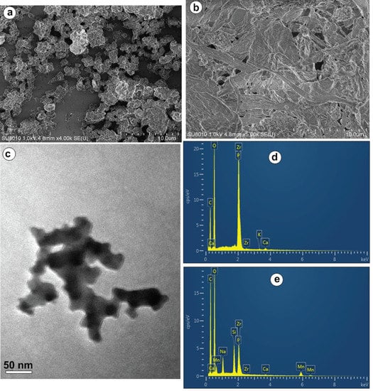 SEM photograph of (a) ZPS-PVPA, (b) catalyst 3, TEM photograph of (c) catalyst 3, and the measured EDS image of (d) ZPS-PVPA, (e) catalyst 3.