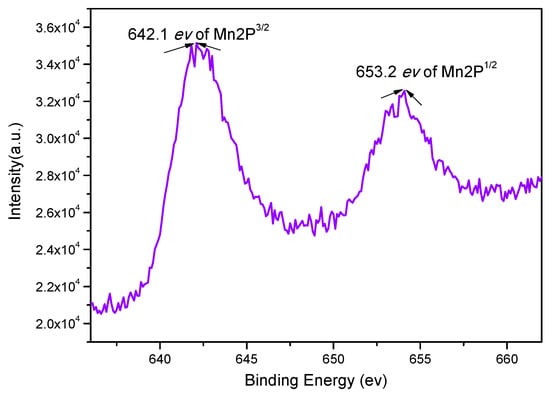 X-ray photoelectron spectroscopy (XPS) is extensively used to obtain detailed information about the state of metal species on surfaces, and to investigate the electronic properties of the species formed on the surface []. Figure 6 shows the Mn 2P XPS spectrum of catalyst 3. There are major peaks with binding energies of 642.1 and 653.2 eV, which correspond to Mn 2 P3/2 and 2P1/2. A similar shift has also been reported earlier, where chiral salen MnIII catalysts and Schiff bases were immobilized on an amine modified ZPS-PVPA through N–Mn bonding [,].