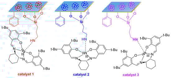 Figure 3 shows X-ray diffraction (XRD) patterns of heterogeneous catalysts 1–3. It can be seen from the XRD spectra that the catalysts have no obvious peak, indicating that the surface morphology of the supported catalyst is mainly amorphous. A broad peak appeared at 2θ = 15.0°–27.8°, which is mainly attributed to the amorphous silica. Furthermore, the fine diffraction peak is attributed to the special structure of the organic/inorganic hybrid zirconium phosphate. Theoretically, each of the composite zirconium salt particles is composed of a plurality of layered composite zirconium salt crystallites, and the arrangement of the crystal planes of the respective zirconium salt crystal grains is randomly arranged. When the homogeneous chiral MnIII (salen) complex catalyst is fixed, it is distributed on the surface of the layer or between the layers. Therefore, the catalyst results are very likely to present a form of ‘short-range order, long-range disorder’.