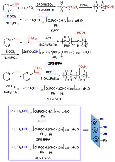 3.1. Synthesis of Organic Polymer/Inorganic Zirconium Hydrogen Phosphate (ZSPP, ZPS-IPPA and ZPS-PVPA)