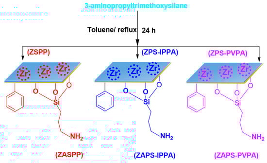 The organic polymer–inorganic zirconium hydrogen phosphate (ZSPP, ZPS-IPPA, or ZPS-PVPA) was added into 50 mL anhydrous toluene, and 1.2 mL of 3-aminopropyltrimethoxysilane was syringed into it. The reaction mixture was then kept at 80 °C for 12 h. After completion of the reaction, it was cooled to room temperature, filtered, washed successively with toluene, water, and ethanol, and dried overnight at 60 °C under vacuum to obtain amine modified organic polymer–inorganic zirconium hydrogen phosphate. The solid products were abbreviated as ZASPP, ZAPS-IPPA, or ZAPS-PVPA (Scheme 3).