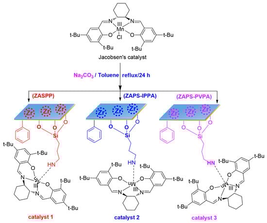 In a 50 mL round bottom flask, ZASPP, ZAPS-IPPA, or ZAPS-PVPA (0.2 g) was added, then 10 mL of toluene was immersed in solids, swelled for 30 min, and then chiral MnIII (salen) complex (543 mg, 1.0 mmol), Na2CO3 (120 mg, 3 mmol) was added to the reaction flask at the same time. After refluxing for 24 h, the reaction was completed. After cooling to room temperature, it was filtered, and then the brown solid was washed successively with ethanol, dichloromethane, and distilled water, and then dried in a vacuum at 60 °C overnight. The CH2Cl2 filtrate was detected by UV–vis until no peaks could be detected (with CH2Cl2 as reference). Yield: 96.5%, 96.8%, 97.1%, respectively. The loading of MnIII (salen) complex in the immobilized catalysts, based on the Mn element, was 0.056–0.083 mmol/g, determined by AAS (Scheme 4).