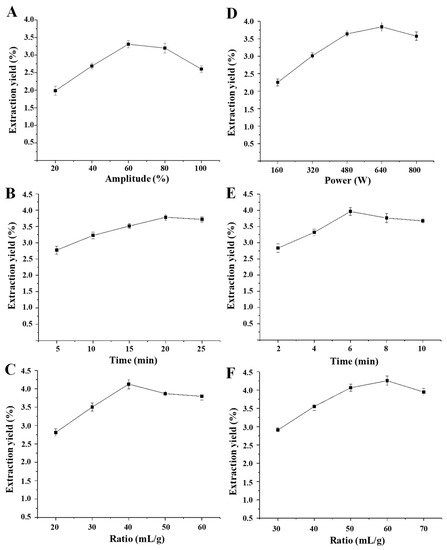 The effects of different extraction parameters of ultrasonic-assisted extraction and microwave-assisted extraction on the yields of polysaccharides extracted from snow chrysanthemum: (A) the ultrasound amplitude, (B) the ultrasound extraction time, and (C) the ratio of water to raw material of ultrasonic-assisted extraction; (D) the microwave power, (E) the microwave extraction time, and (F) the ratio of water to raw material of microwave-assisted extraction.