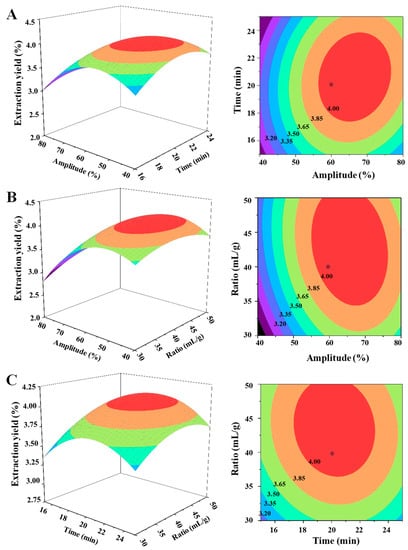 The three-dimensional response surface (left) and two-dimensional contour (right) plots of ultrasonic-assisted extraction: (A) ultrasound amplitude and ultrasound extraction time; (B) ultrasound amplitude and the ratio of water to raw material; and (C) ultrasound extraction time and the ratio of water to raw material.