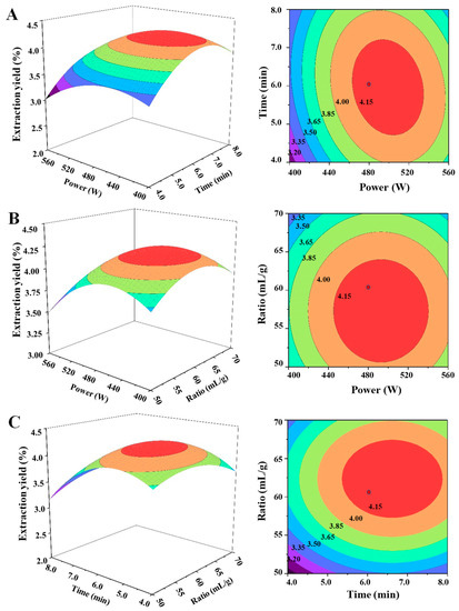 The three-dimensional response surface (left) and two-dimensional contour (right) plots of microwave assisted extraction: (A) microwave power and extraction time; (B) microwave power and the ratio of water to raw material; and (C) extraction time and the ratio of water to raw material.