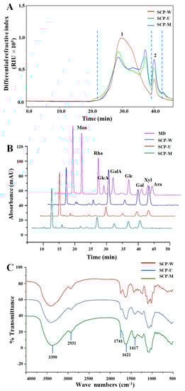 (A) High-performance size-exclusion chromatography (HPSEC) chromatograms, (B) high-performance liquid chromatography (HPLC) profiles, and (C) fourier transform infrared (FT-IR) spectra of SCP-W, SCP-U, and SCP-M; SCP-W, hot water extraction of snow chrysanthemum polysaccharides; SCP-U, ultrasonic assisted extraction of snow chrysanthemum polysaccharides; SCP-M, microwave assisted extraction of snow chrysanthemum polysaccharides; MD, mixed standard of monosaccharides; Man, mannose; Rha, rhamnose; GlcA, glucuronic acid; GalA, galacturonic acid; Glc, glucose; Gal, galactose; Xyl, xylose; and Ara, arabinose.