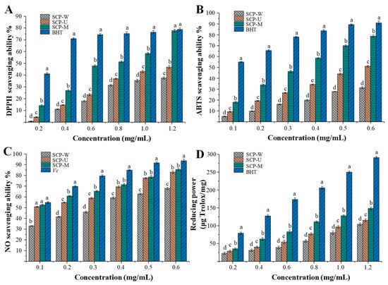 (A) DPPH radical scavenging activity, (B) ABTS radical cation scavenging activity, (C) nitric oxide radical scavenging activity, and (D) reducing power of SCP-W, SCP-U, and SCP-M. SCP-W, hot water extraction of snow chrysanthemum polysaccharides; SCP-U, ultrasonic assisted extraction of snow chrysanthemum polysaccharides; SCP-M, microwave assisted extraction of snow chrysanthemum polysaccharides; BHT, butylated hydroxytoluene; Vc, vitamin C; the error bars are standard deviations; significant (p < 0.05) differences are shown by data bearing different letters (a–d); the statistical significances were carried out by ANOVA and Ducan’s test.