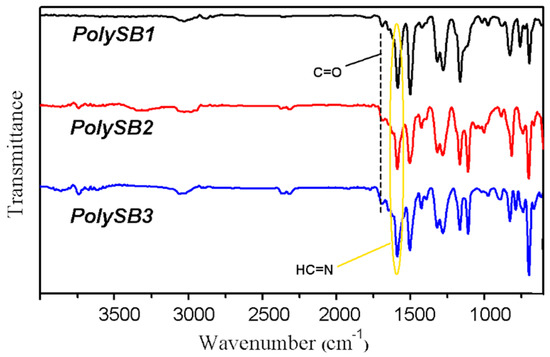 The molecular weight of the polySBs were measured through gel permeation chromatography analysis (GPC), with mono-disperse polystyrene samples as standard and THF as eluent (Table S2). The weight-average molecular weight (Mw) were 3.9 × 103, 4.5 × 103 and 1.4 × 104 g moL−1 for polySB1, polySB2 and polySB3; respectively, while the (Mn) values allowed us to establish the polymerization degree for the samples: dimer for polySB1 and trimer for polySB2 and polySB3. We have obtained similar results in previous work by preparing several silylated-poly(azomethine)s [29,31]. On the other hand, the polydispersity index (PDI) was in the range of 2.17–5.57, with a clear trend to increase with the increment of the molecular weight values. The higher molecular weight of polySB3 would be related to the incorporation of m-phenyl di-substituted units which would increase the flexibility of the small-chain and, therefore, their mobility in solution during the polycondensation reaction which would favors the incorporation of the new repeat units and as result an increase in the molecular weight can be achieved [43].