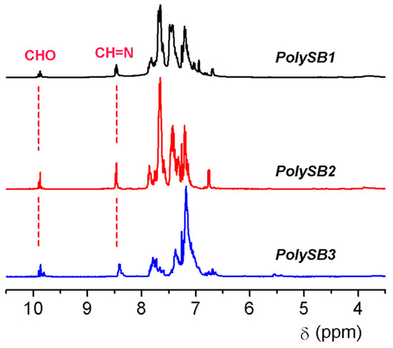 NMR spectra of polySBs also confirmed the proposed structure for the repeat units. In the 1H NMR spectra (Figure 3), the imine hydrogen of the monomer linker moieties appears at about 8.5 ppm. The aromatic hydrogens were observed like complex signals in the range of 7.95–6.57 ppm. In accordance with FT-IR observations, all spectra show a signal around 9.9 ppm which is attributable to the terminal aldehyde units.